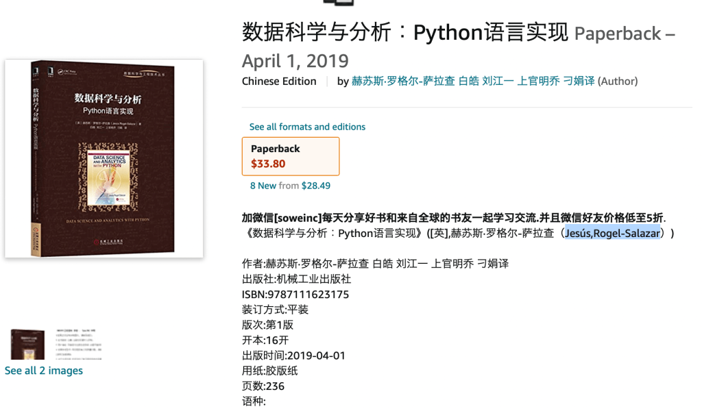I received a notification that my "Data Science and Analytics with Python" book is now available in Chinese. Great news and 谢谢!