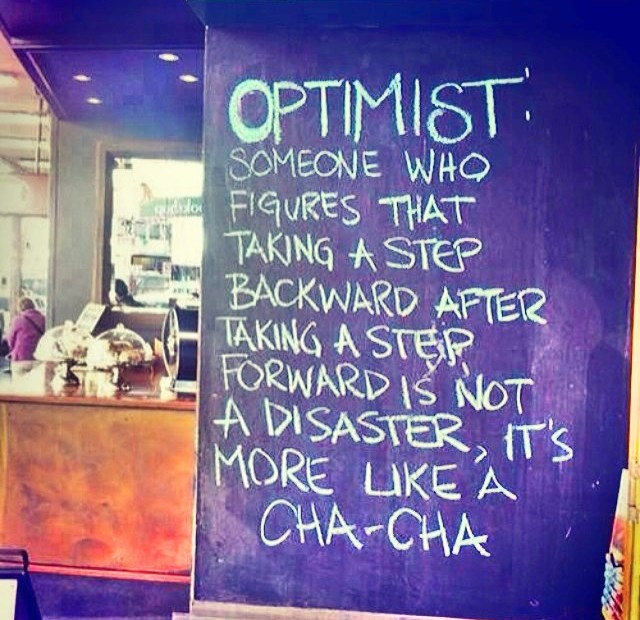 Optimist: Someone who figures out that taking a step backward after a steer forward is not a disaster… it’s more like a cha-cha…