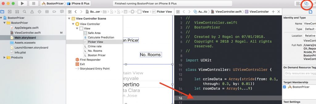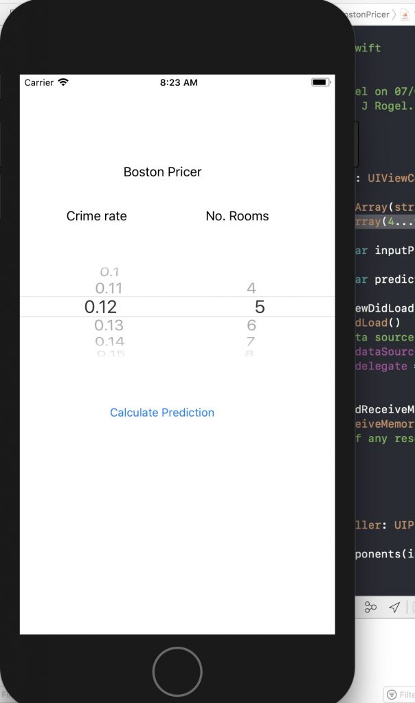 Right! Where were we? Yes, last time we put together a skeleton for the CoreML Boston Model application that will take two inputs (crime rate and number of rooms) and provide a prediction of the price of a Boston property (yes, based on somewhat all prices…). We are making use of three three labels, one picker and one button.