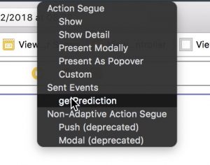 There are several way we can connect the button with the code above. In this case we are going to go to the Main.storyboard, control+click on the button and drag. This will show an arrow, we need to connect that arrow with the View Controller icon (a yellow circle with a white square inside) at the top of the view controller window we are putting together. When you let go, you will see a drop-down menu. From there, under “Sent Events” select the function we created above, namely getPrediction. See the screenshots below: