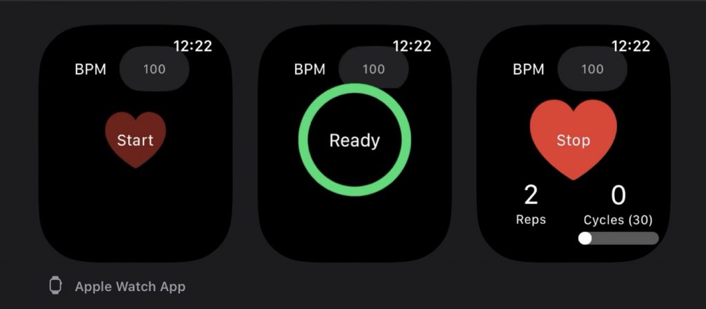 Given the typical usage of the Apple watch, I have simplified the animations and ensured that the compression counts are voiced. Note that when the watch is in an inactive state, the count may need to catch up with the tempo. However you should still get a Haptic Touch at the right moment.
