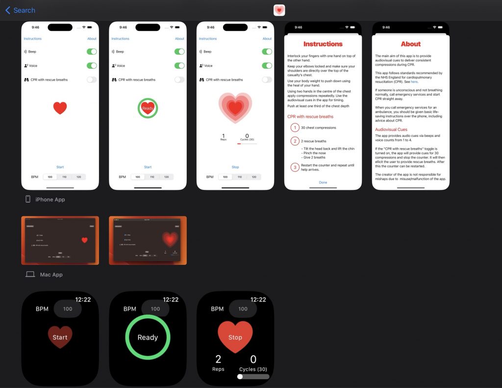 Early, high-quality CPR, including compression only CPR particularly in cases were a defibrillator may not be immediately available is an important factor in saving a person’s life. This is the main reason I have created Easy CPR. The app is available for iOS and macOS.