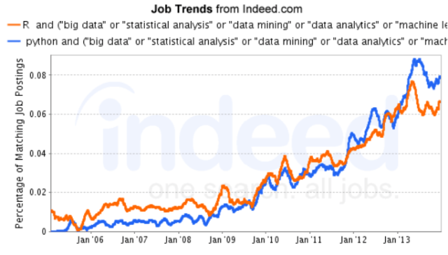That said, as you can see, Python has started to overtake R in data jobs. Thanks to the expansion of the Python ecosystem, tools for nearly every aspect of computing are readily available in the language. In addition, since Python can be used to develop web applications, it enables companies to employ crossover between Python developers and data science teams. That’s a major boon given the shortage of data experts in the current marketplace.