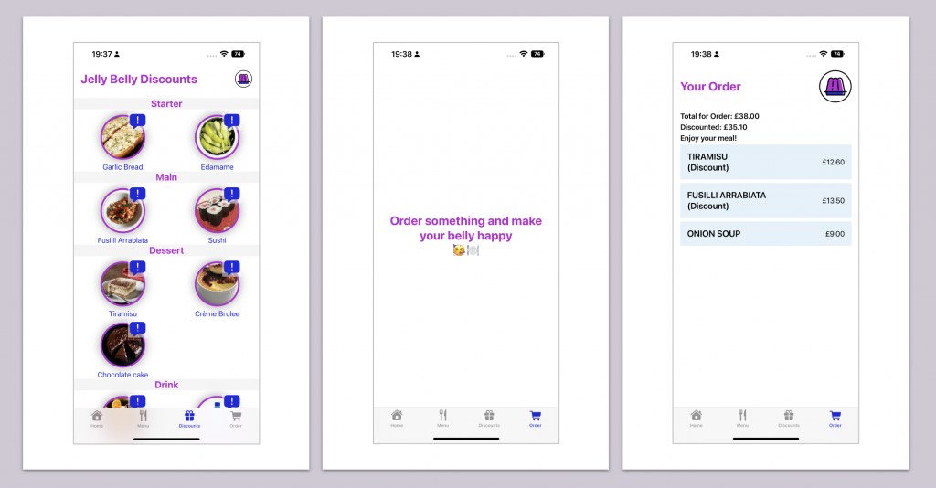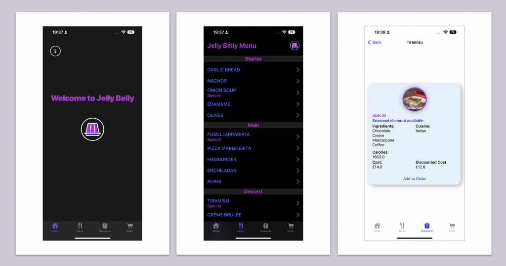 Looking at the differences between things such as @Binding, @State, @ObservedObject, @StateObject and @EnvironmentObject. I used environment objects in my assignment to be able to pass information form a restaurant menu view to a screen where an order for the user is presented. Let us take a look at how Jelly Belly is looking now.