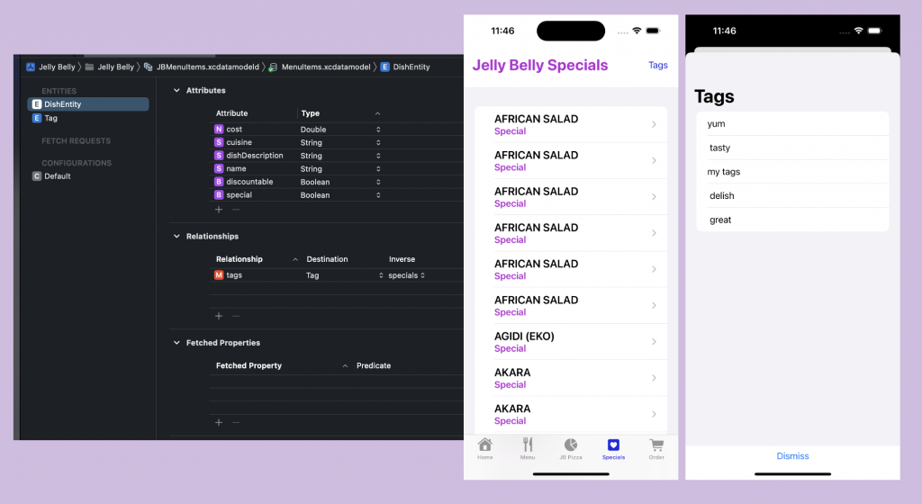 Finally I have used the same information to save a simplified version of the data model into Core Data and use that to present a new tab called Specials where the user can see the Specials in the menu, ordered by cost and name and is able to add tags. These tags are also persisted in the app.