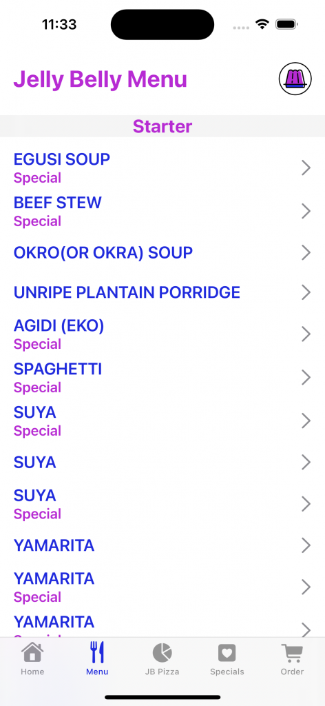 With the updates I made to the app in the last few weeks, we were able to retrieve data from an API and this time we were able to save the data and changes in the app. The API used is a bit limited and I had to map some of the information coming from the API to my existing data model . The end result is a dish menu that is populated with dishes coming from the API – the data is unfortunately a bit dirty and there are a number of duplications… In any case, the Menu now looks like this