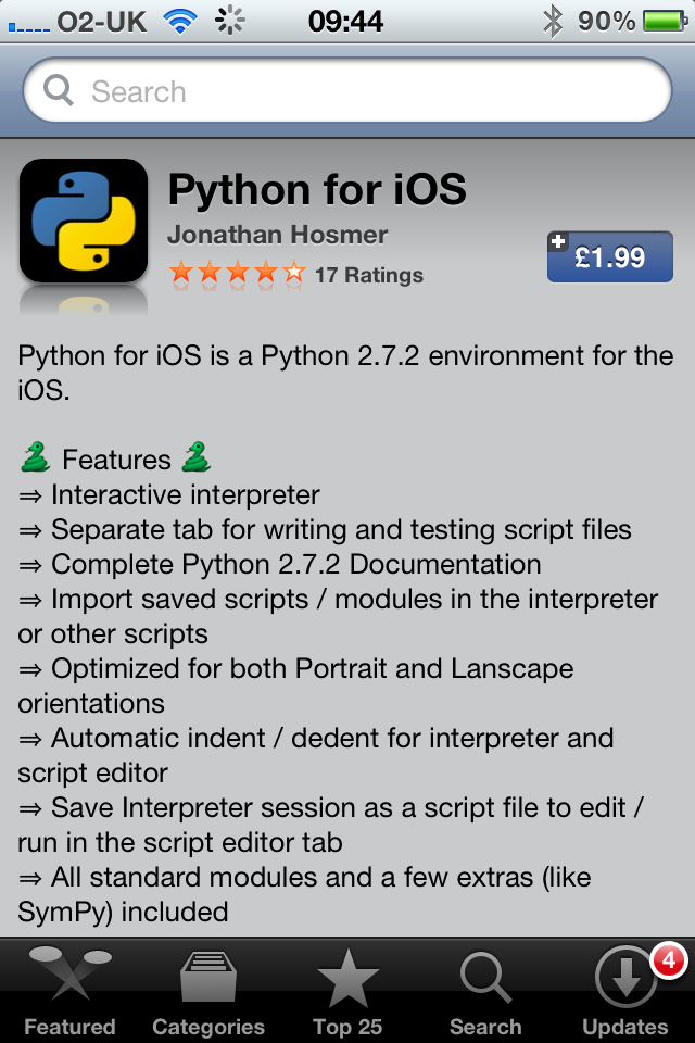 iPhones and iPads are indeed powerful devices, but in their wisdom Apple would not let you easily program them. Fortunately people are not easily convinced to drop it and recently I came across Python for iOS which is available in the AppStore. The application provides us with a simple Python interpreter that make it easy to use in these devices. The user needs to remember that the application does not create native apps, but the tool might be very handy in conjunction with a more advanced development tool. Also, it has the added bonus of allowing newcomers to start programming in devices that are largely seen to be purely as consumer ones as well as using a popular language.